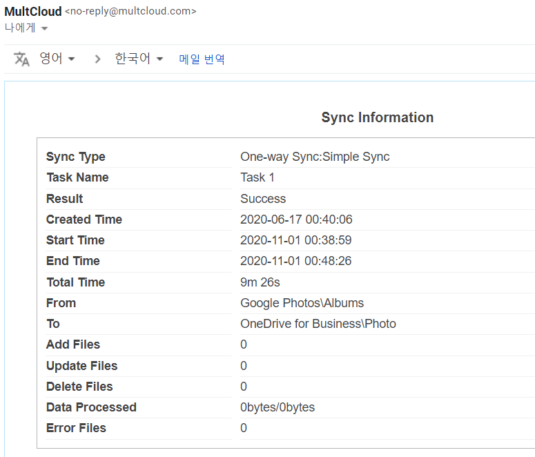 저 같은 경우는 매일 확인해서 백업하는 걸 선택했는 데, 매일 제가 설정한 시간에 싱크 작업을 하고 그 결과도 메일로 위와 같이 알려줍니다.