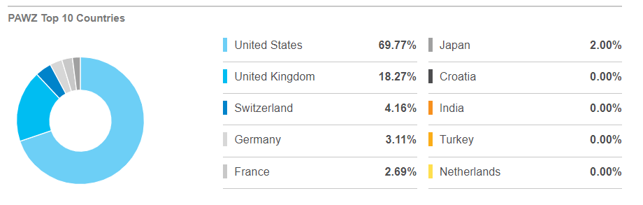 애완 동물 시장 자체를 타겟으로 하는 만큼 투자 대상이 되는 기업으로 전세계 48개의 증권 시장에 상장된 기업을 대상으로 하고 있고, 그 중에서는 미국 소재 기업의 비율이 현재로서는 약 70%정도로 가장 많습니다.