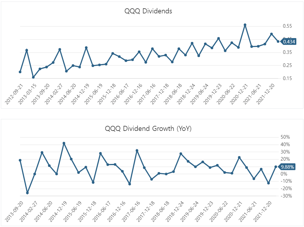 기술, 성장주가 주로 모여 있는 ETF라 기업이 지불하는 배당금이 많지 않아서 분배금 또한 많지는 않습니다. 대략, 두 ETF 모두 0.5% 내외로 배당 투자로는 당연히 적합하지 않고 성장성을 보고 투자하는 ETF입니다.