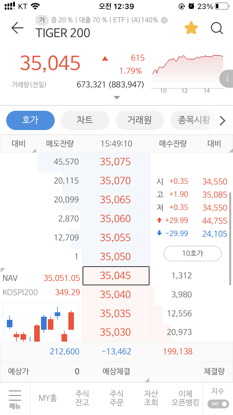 예를 들어, 국내에서 많이 거래되는 TIGER 200 ETF의 호가창을 보면 다양한 가격에 팔거나 사려는 수량이 꽉 차있는 것을 볼 수 있습니다.